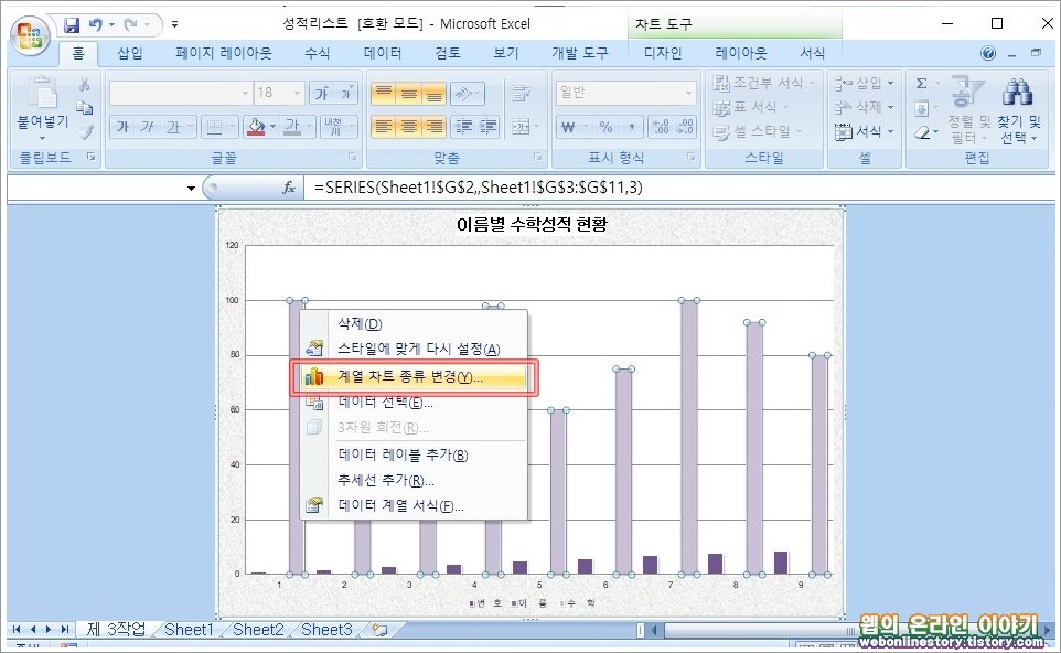 예제에서 제시한것을 적용하기 위해서 차트를 우클릭하여 '계열 차트 종류 변경' 메뉴를 선택합니다.