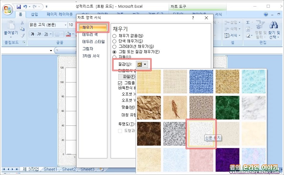 ■ 차트영역서식 대화상자를 불어왔다면 질감을 '채우기 효과(질감-신문 용지)' 를 선택합니다.