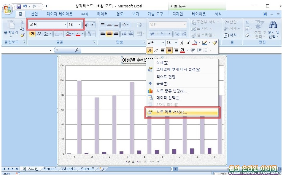 ■ 5, 제목 서식 => 글꼴(굴림, 굵게, 18pt), 채우기(흰색). 제목 서식을 변경하기 위해서는 제목을 선택한 상태에서 글꼴과 크기를 변경하고, 마우스 우클릭하여 '차트 제목 서식' 을 선택합니다.