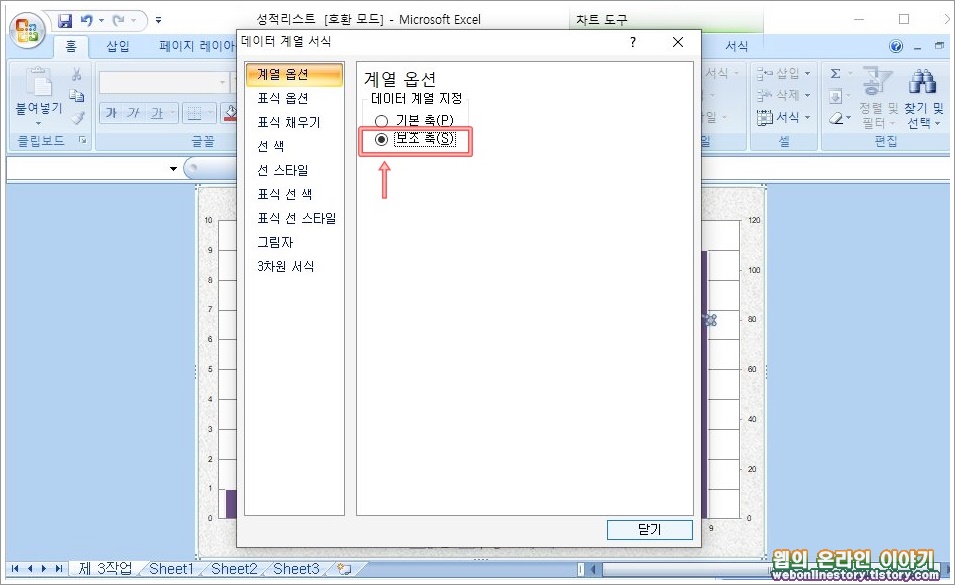 ■ 데이터 계열 서식 대화상자를 불러왔다면 계열 옵션을 '보조 축' 으로 지정을 합니다.
