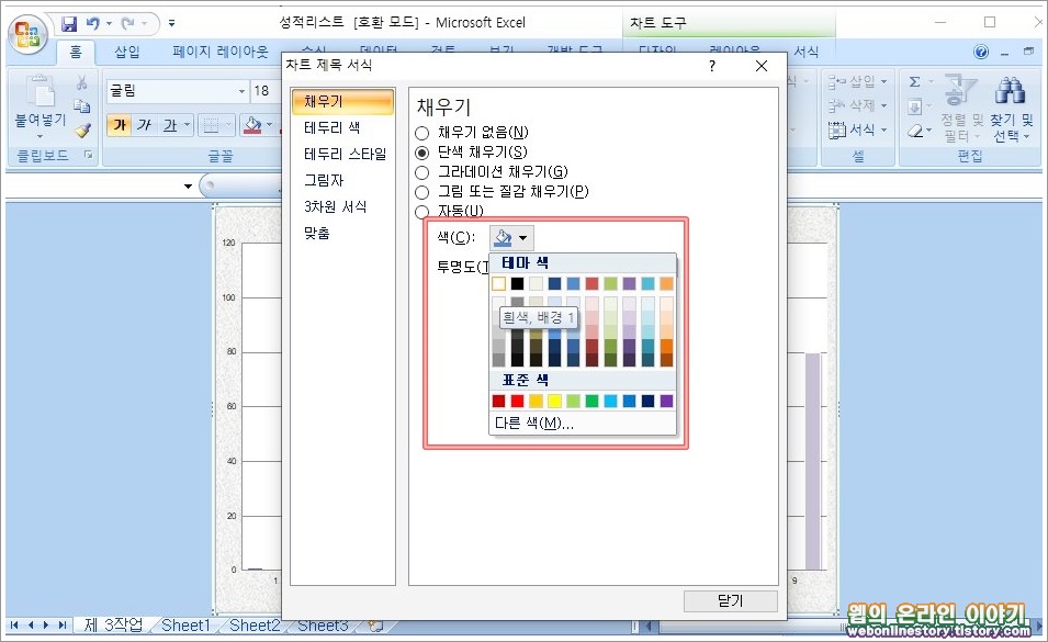 ■ 차트제목서식 대화상자를 불러왔다면 채우기 '색-흰색' 배경을 선택합니다.