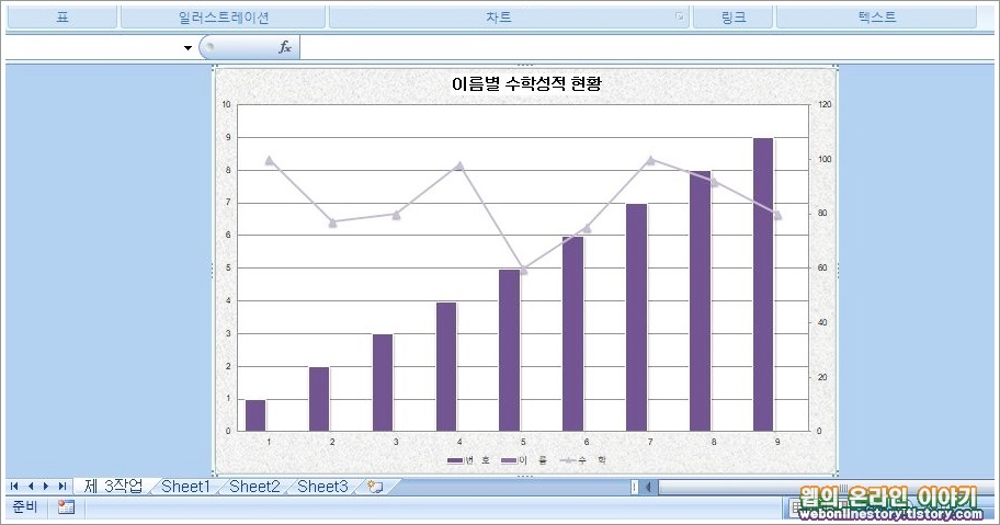 ■ 아래와같이 새 시트 '제 3작업' 가 추가 되어 차트가 만들어진것을 확인해 볼수가 있답니다.