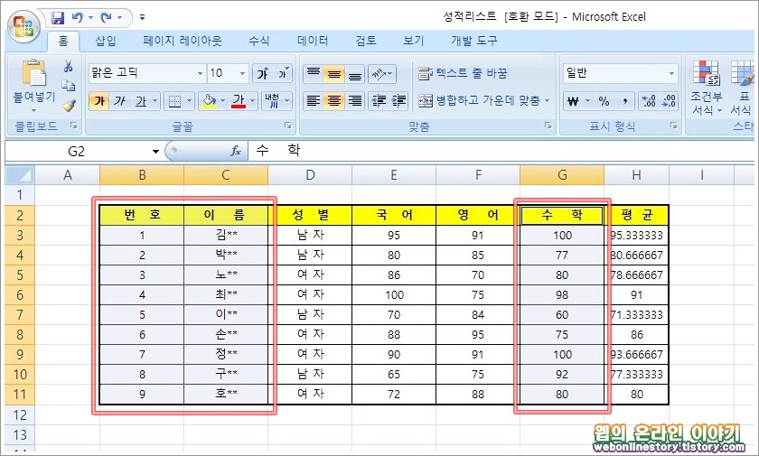 ■ 최근에 출시되는 유인물 예제를 가지고 조건에 맞게 엑셀 차트를 만들어 보고자 합니다. 1, 데이터 범위는 번호, 이름, 수학 범위를 각각 선택합니다. 'Ctrl + 마우스 드레그' 를 하여 원하는 데이터 범위를 선택할수가 있습니다.