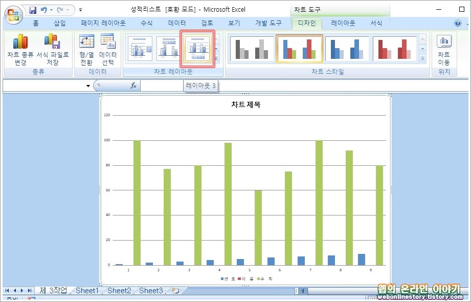3, 위치 => 새 시트로 이동하고 '제 3작업' 으로 시트 이름을 변경합니다. 차트가 추가되었다면 '디자인'탭 에서 오른쪽 상단에 위치한 '차트 이동' 을 선택합니다.