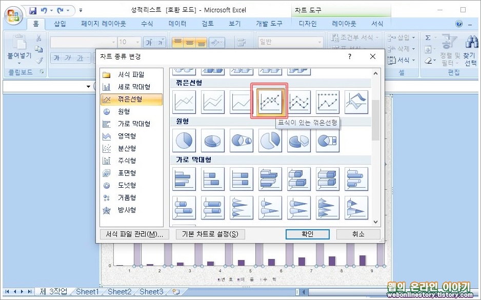 ■ 차트 종류 변경 대화상자를 불러왔다면 '꺽은 선형 - 표식이 있는 꺽은선형' 을 선택합니다. 여기서 원형, 가로 막대형등 사용자가 원하는 차트 종류를 변경할수가 있답니다.