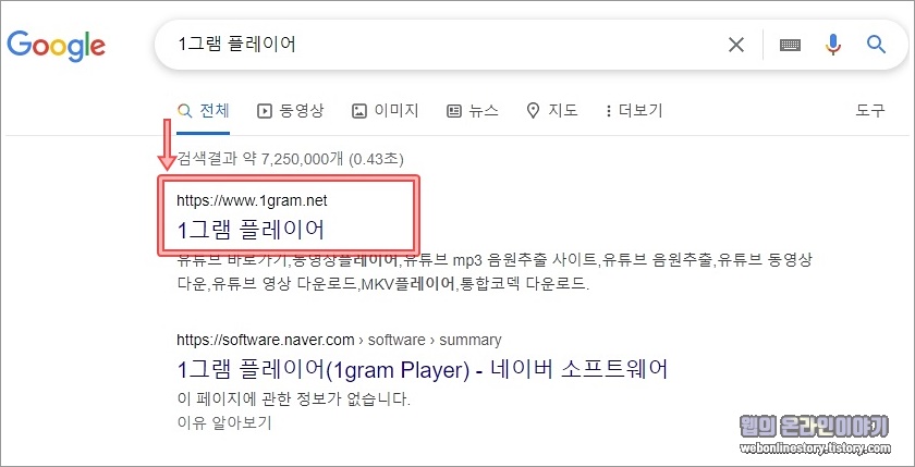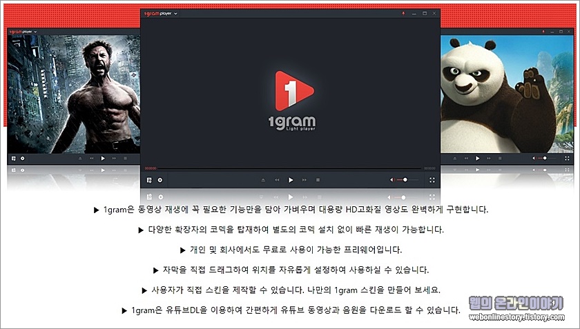 사용하기 위해서는 '1그램 플레이어' 를 검색하여 홈페이지를 통해서 PC앱, 모바일앱 두가지 버전을 지원하며 다운로드가 가능합니다.